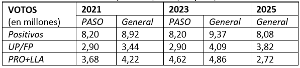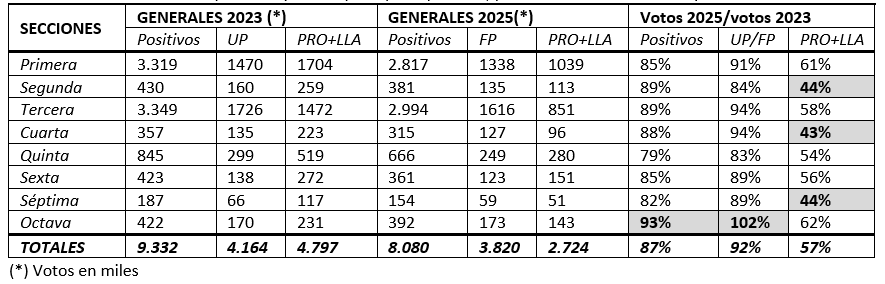 Tabla 1: cantidad de votos positivos, al UP/FP y LLA/PRO