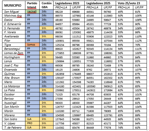 Tabla 3: Cantidad de votos a los dos principales partidos 2023-25, según principales municipios del AMBA